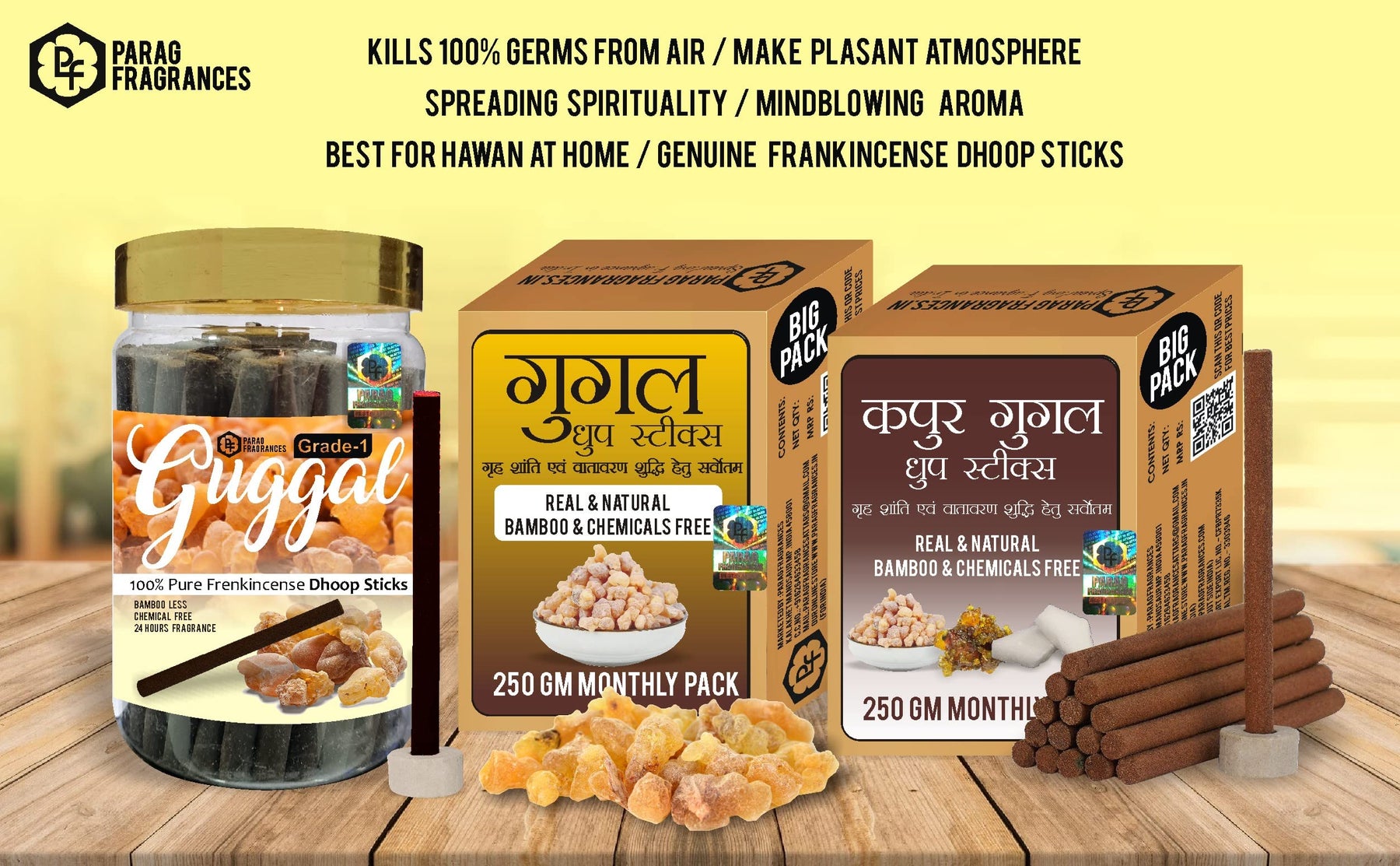 Our Mostly Incense And Dhoop Sticks Is Handmade For Giving More Strong Aroma In Atmosphere. Also All Our Products Are Making By Poor Women, Providing Them With Predictable And Healthy Livelihoods. Charcoal Free Incense sticks on burning, produces very less somke and a lot of amazing fragrance to calm your heart and soul. Researchers and scientists have adviced to use charcoal free incense sticks every time when you feel anxious, doing meditation or need air purification. We Use Natural Essential Oils For Making Our Products. Its Provide Mind-Blowing And Naturally Fragrant Environment At Home Office And Puja Room. Parag Fragrances Have Largest Range in Best Quality Dhoop Sticks, Dhoop, Dhoop Incense Sticks, Incense Stick, Hawan Samagri, Hawan Powder, Dhoop Powder, Sambrani Cup, Hawan Cup, Loban Powder, Guggal Powder, Guggal and Loban Candy Dhoop Stick, Natural Resin of Frankincense & Luxury Dhoop and Incense.